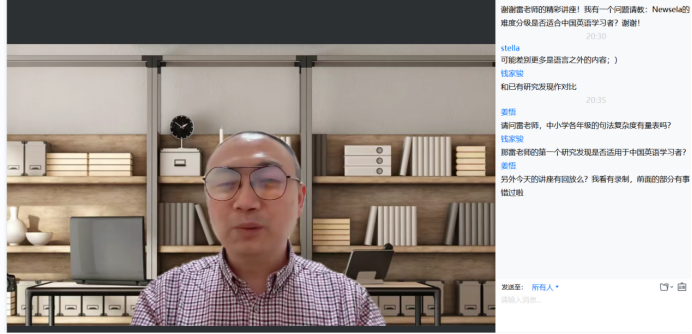 第二项研究是关于二语写作历时研究。雷蕾以1081名中国老员工在连续四个学期内所写的二语作文为语料,分析了句法复杂度的历时变化以及英语水平和体裁差异。研究表明,随着时间的推移,二语作文的句子长度、并列句和短语复杂度指数明显增加,而从句指数明显下降;员工的写作风格变得更加正式,表现出更突出的学术语篇特征。此外,研究表明员工水平和写作体裁对大多数句法复杂度指标均有显著影响。该研究补充了现有写作发展模式,为二语写作教学与研究提供了一定的启示。雷蕾另就ChatGPT应用、学术论文写作等问题,与线上听众展开了交流与讨论。
