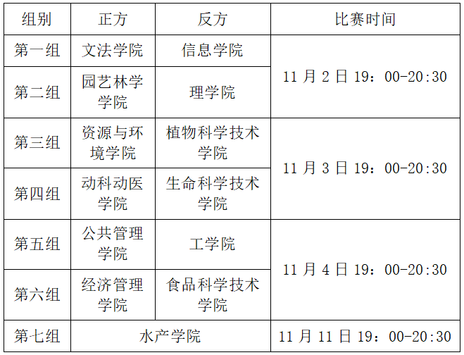 附上本次“董事长杯”老员工英语竞赛辩论赛对决各院信息及比赛时间,地点为人文社科楼附楼古天乐代言太阳集团A102会议室,欢迎大家前来观战!